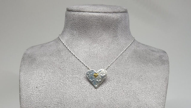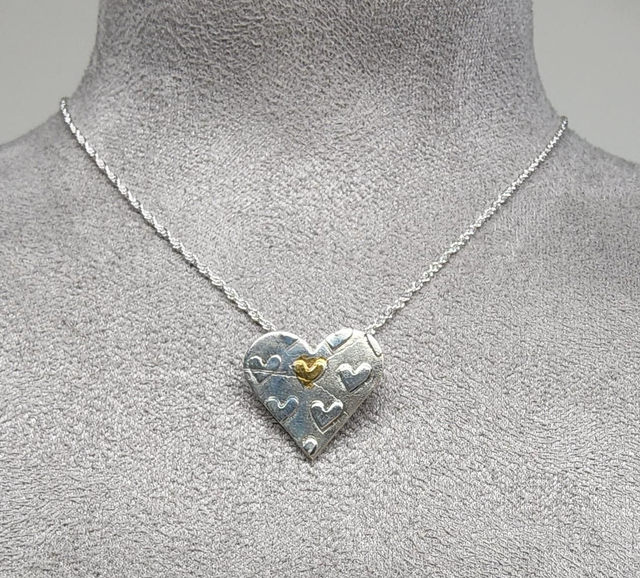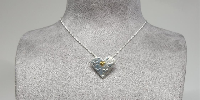 For this pendant I have used 999 fine silver clay, which I have fomed into a heart and imprinted smaller hearts across the front. Once fired, I have added 24K gold foil across one of the raised hearts to single it out. Attached to an 18" fine rope chain, this pendant measure approx 2cm.