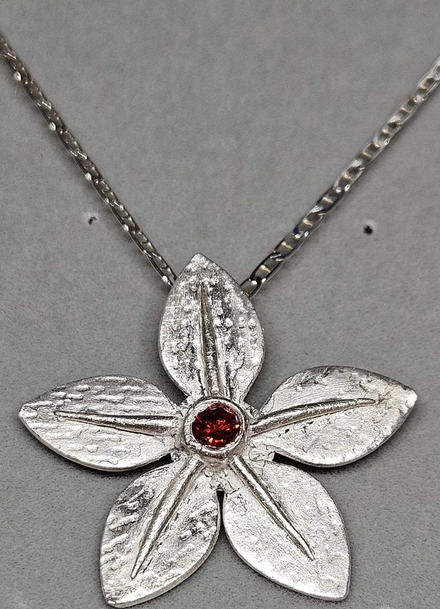 This pendant has been handmade using 999 silver clay, which has been made into a flower, by individually creating each petal, which I have then joined and embelleshed with a stunning round padparadscha cubic zirconia, which is a beautiful burnt orange colour. This unique pendant is supplied with an 18" sterling silver chain, cleaning cloth and gift boxed.