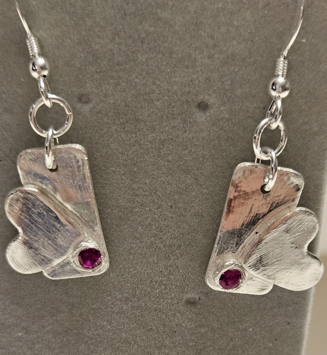 These have ben made using silver clay, which have been formed into the individual components which have then been attached, with a fuschia cubic zirconia added to each. Once refined and fired, sterling silver hooks have been added.