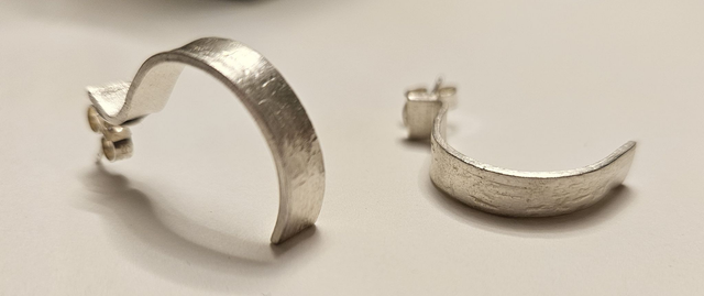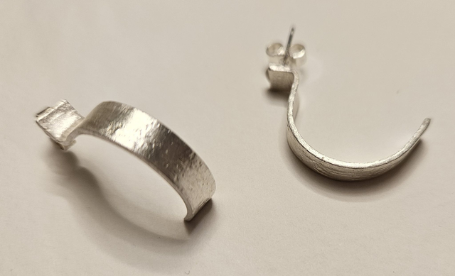 These earrings have been made using silver clay, which has been cut to form open hoops. Once refined and fired, sterling silver studs have been aded and the surface area has been lightly textured.